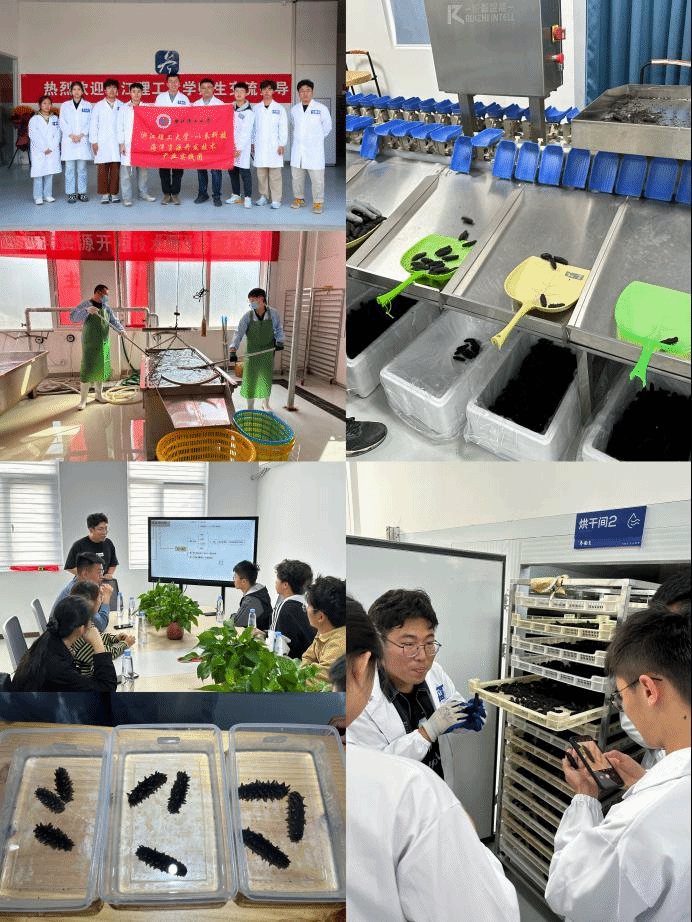 随后,实践团来到莱山区参船长海参合作社,进一步了解学习海参的工厂化加工流程企业负责人及相关工作人员为师生们展示了海参的加工全流程,包括初步蒸煮、二次清洗、低温风干、高温烘干、外形修整、产品分级、产品储存等。在参观过程中,师生们了解到风干的过程中海参表面会析出盐分和其他分泌物,蒸煮是去除杂质和提高产品质量的关键过程,控制蒸煮时间和温度是每个工厂“大师傅”的独门绝技,也体会到了海洋资源产品生产标准化工艺的重要性。工作人员介绍,海参加工产品需要一系列的质检环节,包括蛋白质、多糖等功能物质含量抗生素、农药残留含量,甚至放射性元素含量的检测。企业负责人欢迎同学们回校后将海参产品检测作为课题继续开展产业实践。在工作人员的帮助下,师生们进行了海参泡发,还品尝了工厂正在研制的原味海参,对于海参应该如何泡发、海参泡发过程以及泡发完全后的形态有了深入的认识,同时也通过了解原味海参与泡发海参的口感显著差异,深刻体会到海参深加工技术开发的必要性。