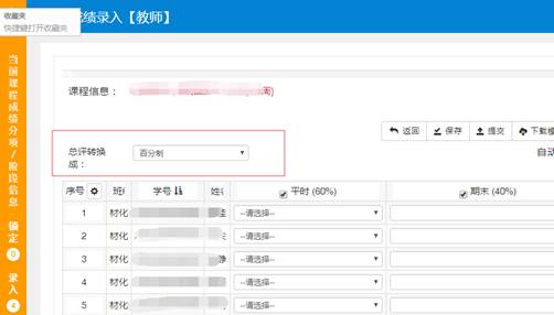 (1)在线录入:录入成绩分项比例不为“0”的选项的成绩(百分制的成绩分项按百分制录入,切勿录入折算后的分数,比如平时50%,某同学90分,录入90,不能录入45);录入后,总评栏会自动计算。