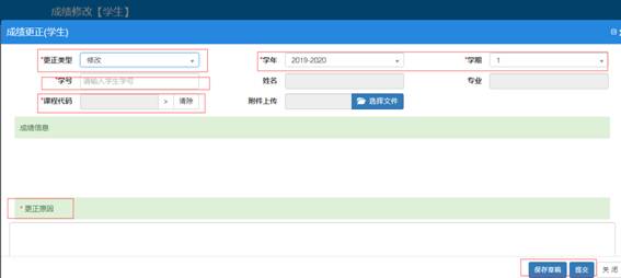更正类型选择“修改”,选择正确的学年学期、学号、课程,录入更正原因后,点击右下方的“保存”、“提交”按钮。