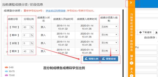 选择成绩分项比例:选择“平时、实验、期末等”分项所占比例,可根据课程情况进行调整,但各项之和需为100%,建议平时成绩所占比例占40%及以上,调整的项目左边打勾,再点击下方“调整比例”按钮;