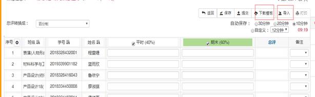 (2)成绩导入:成绩录入界面右上角有“下载模版”按钮,下载填好后,点击“导入”上传成绩。