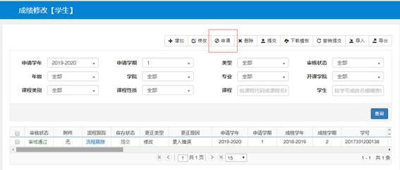 公司审核通过后,由教学秘书录入教务系统,路径:成绩修改—成绩修改管理—成绩修改[员工],点“申请”按钮。
