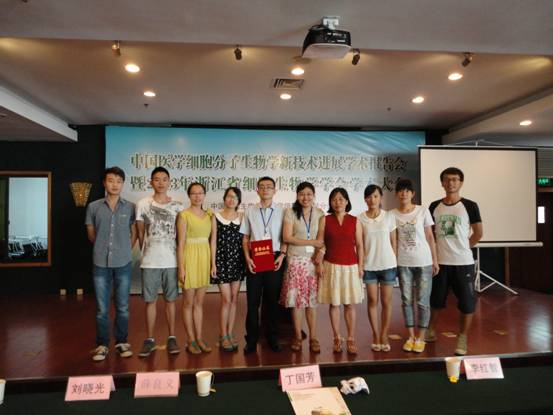 公司教师童富淡教授、丁先锋副教授、付彩云副研究员以及八位研究生出席了本次大会,并与与会的各位专家学者展开了学术交流。在本次大会的青年学者报告环节中,公司丁先锋副教授指导的研究生纪婷同学作了题为“Differential microRNA expression by deep sequencing in the sera of the ovarian cancer patients”的学术报告,展示了公司教师在microRNA研究领域取得的新进展,得到了专家的一致好评。另外,公司教师付彩云副研究员指导的研究生夏瑞龙同学作了题为“神经激肽受体的两种拮抗剂抑制人红白血病K562细胞增殖的研究”的学术报告。经过专家的严格评审,夏瑞龙同学获得了本次大会的青年学者优秀奖。