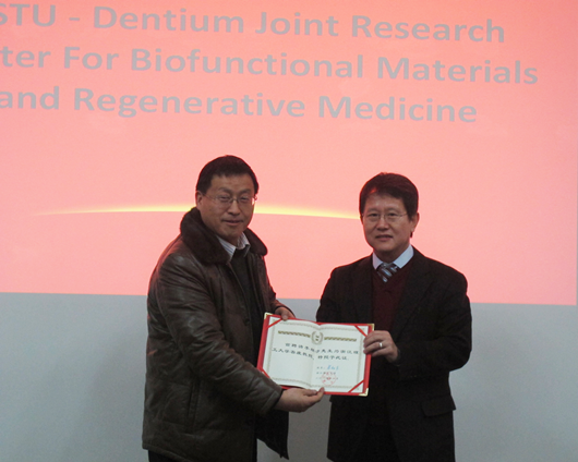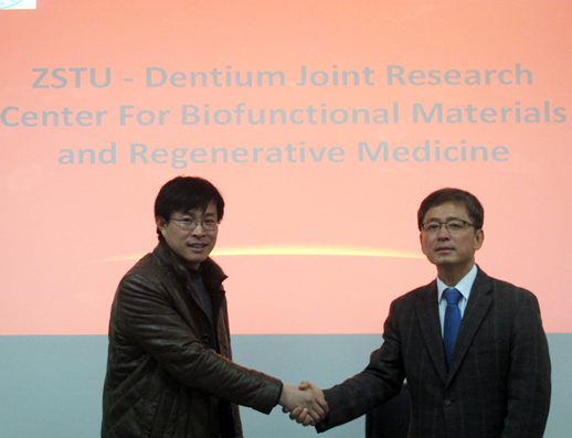 2014年1月17日,韩国登腾公司(Dentium Co. Ltd.)创始人兼CEO Sungmin Chung博士及公司驻中国区域总监Jamie Lee博士,韩国延世大学In-Seop Lee 教授一行3人访问B-Sports,并与公司就共建“生物功能材料和再生医学联合研究中心(ZSTU-Dentium Joint Research Center for Biofunctional Materials and Regenerative Medicine,Bio-X Center)”签订合作协议。仪式在6号楼226隆重举行,生命科学公司经理梁宗锁、副经理孔祥东以及公司部分师生代表参加了签约仪式,签约仪式由孔祥东副经理主持。