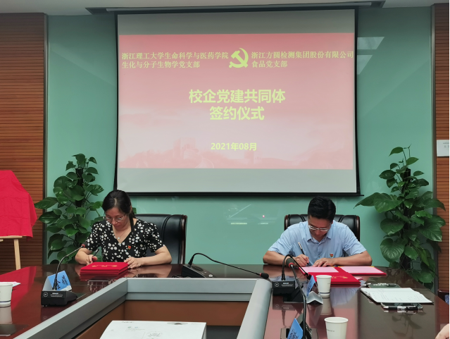 暑假期间,公司生物化学与分子生物学党支部与浙江方圆检测集团食品党支部举行了校企党建共同体签约揭牌仪式。浙江方圆集团党委副书记金晖、食品党支部书记盛华栋、食品检验所副所长张水峰博士和刘鹏鹏等相关科室负责人,以及公司党委书记丁春平、经理梁宗锁、副书记楼玉兰和党支部书记俞梅兰等教师代表出席仪式。
