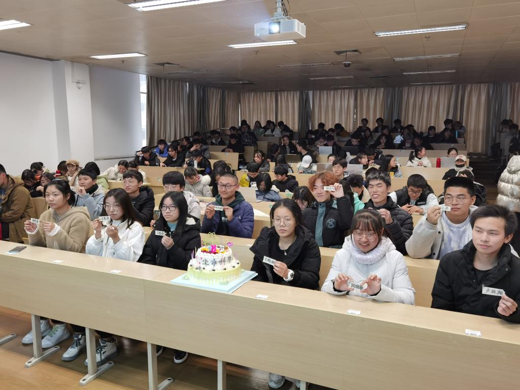 随后的冬季送温暖活动将教室气氛推向了另一个高潮。“校十佳老员工”、保研华东师范大学的陈雯琪,省政府奖学金获得者、保研浙江大学的骆航琦两位高年级优秀员工代表在新生不知情的情况下,手捧五彩生日蛋糕进入教室,为12月过生日的15位新生庆祝生日,同时也带来了两位优秀学姐美好的祝福与期待。她们代表全体毕业生祝福全体新生期末考试取得理想的成绩,在大学四年留下最美好的青春足迹,在毕业时成长为有理想、有本领、有担当的有为青年!唱生日歌、许愿、吹蜡烛,教室内的气氛无比温馨,来自全国各地的140多位新生仿佛成为了一家人,其乐融融。