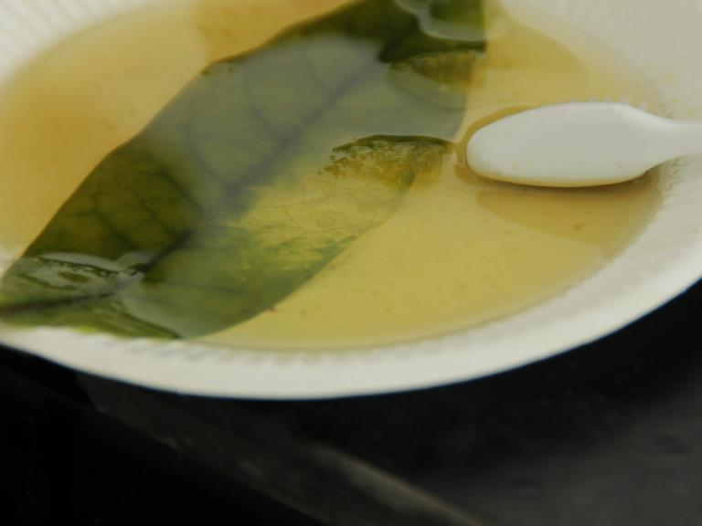 将树叶放入容器中加热至煮沸,液体颜色逐渐变深,观察叶片情况煮沸后可小火煮10-15分钟取出