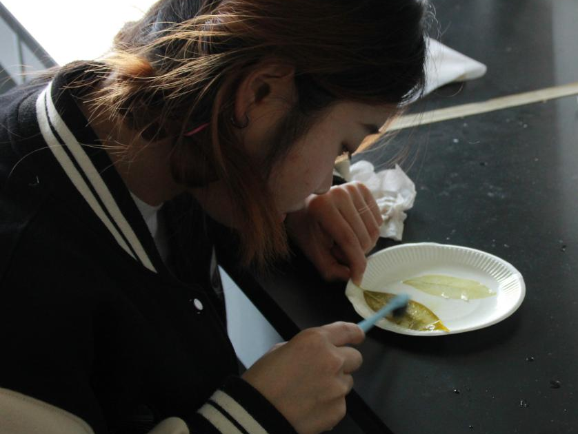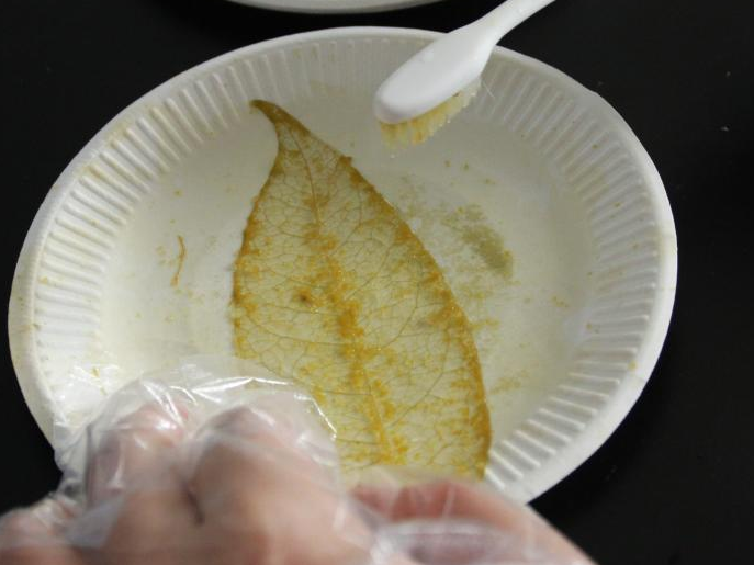 用镊子将叶片取出,用清水冲洗,再用牙刷沿着叶脉方向刷去叶肉
