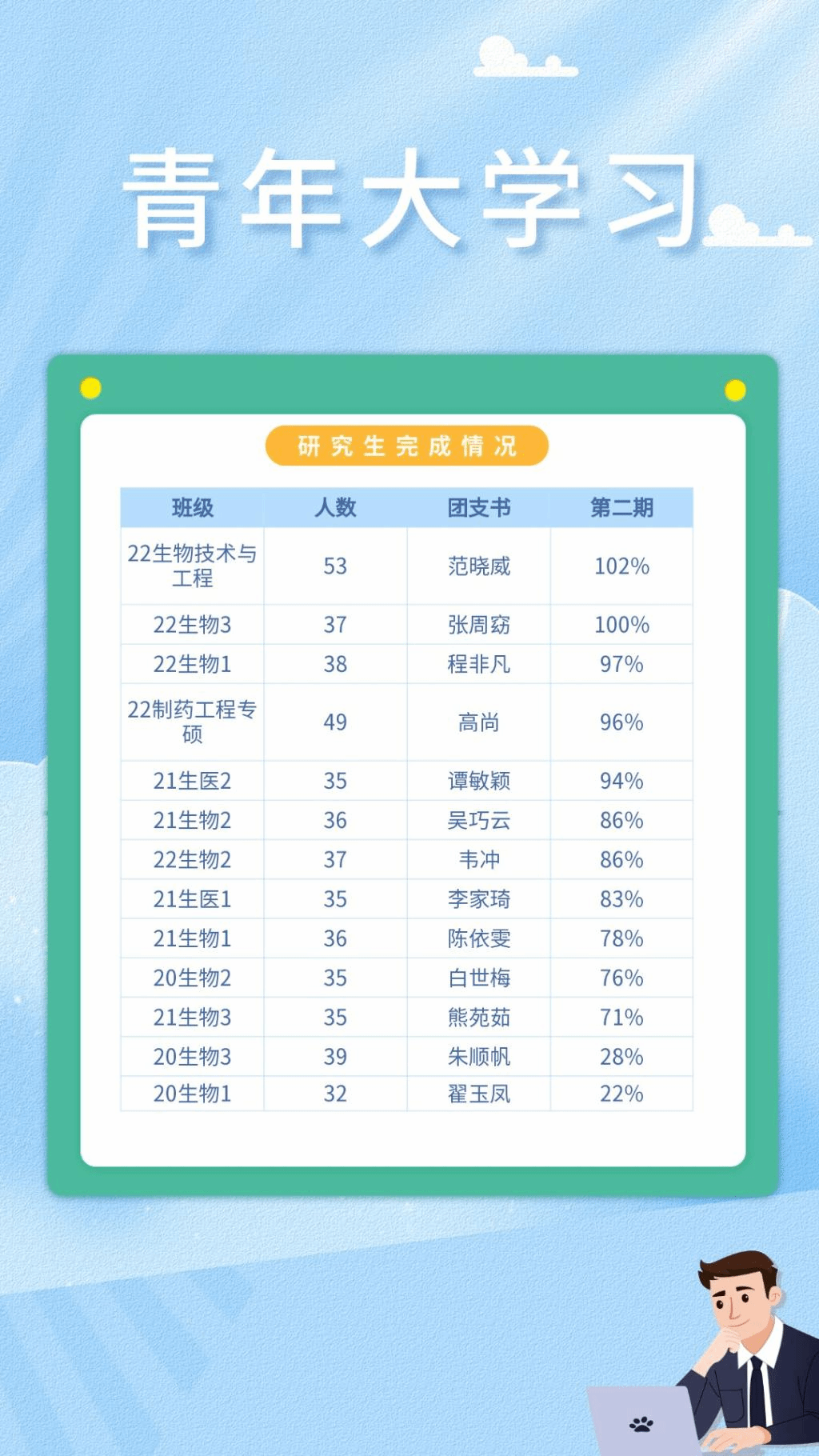 22生物1班、22生物技术与工程、21生医2班、21生物2班、22生物2班、21生医1班、21生物1班、20生物2班、21生物3班、20生物3班、20生物1班完成率达到90%以上;22生物3班完成率达到100%及以上。