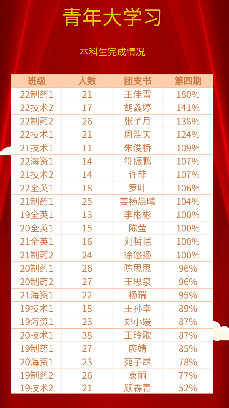 其中本科生:22制药1班,22技术2班,22制药2班,22技术1班,21技术1班,22海资1班,21技术2班,22全英1班,21制药1班,19全英1班,20全英1班,21全英1班,21制药2班完成率均为100%及以上;20制药1班,20制药2班,21海资1班完成率均为90%以上;19技术1班,19海资1班,20技术1班,19制药1班完成率均为80%以上;20海资1班,19制药2班完成率均为70%以上;19技术2班完成率为52%。