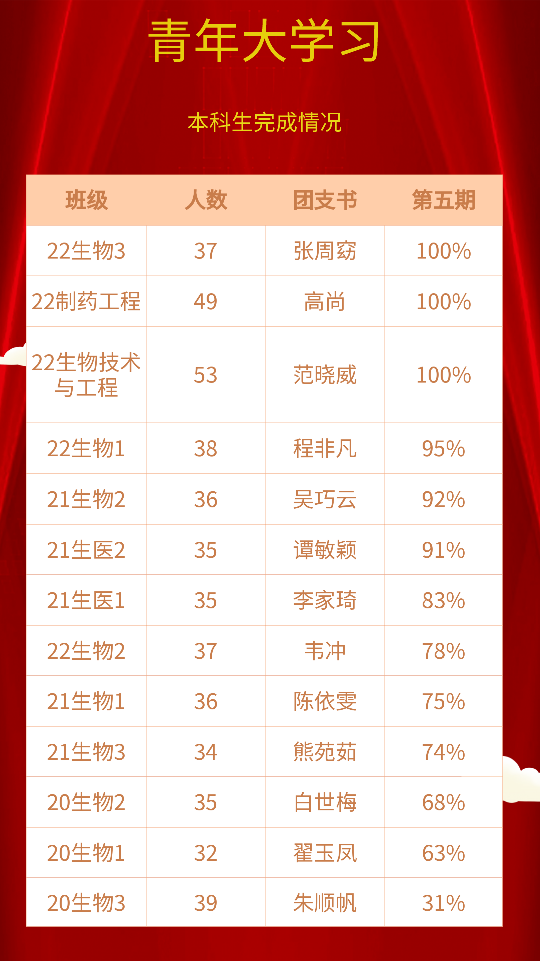 研究生:22生物3班、22生物技术与工程班、22制药工程班的完成率达到100%,22生物1班、21生物2班、21生医2班的完成率达到90%以上。