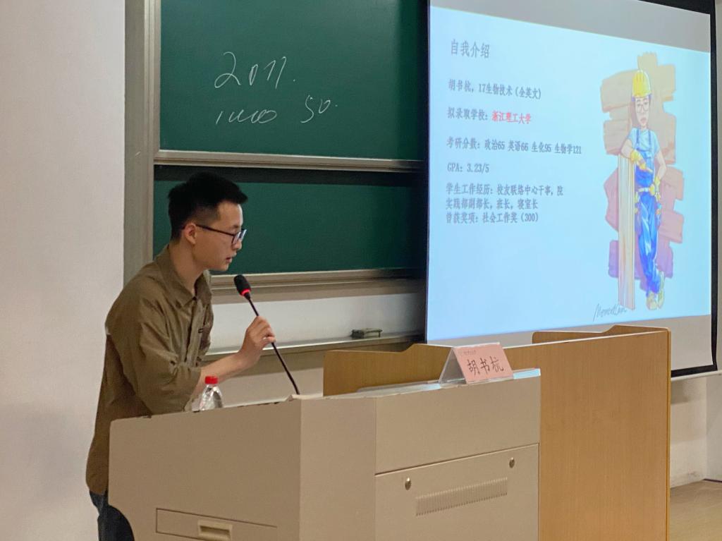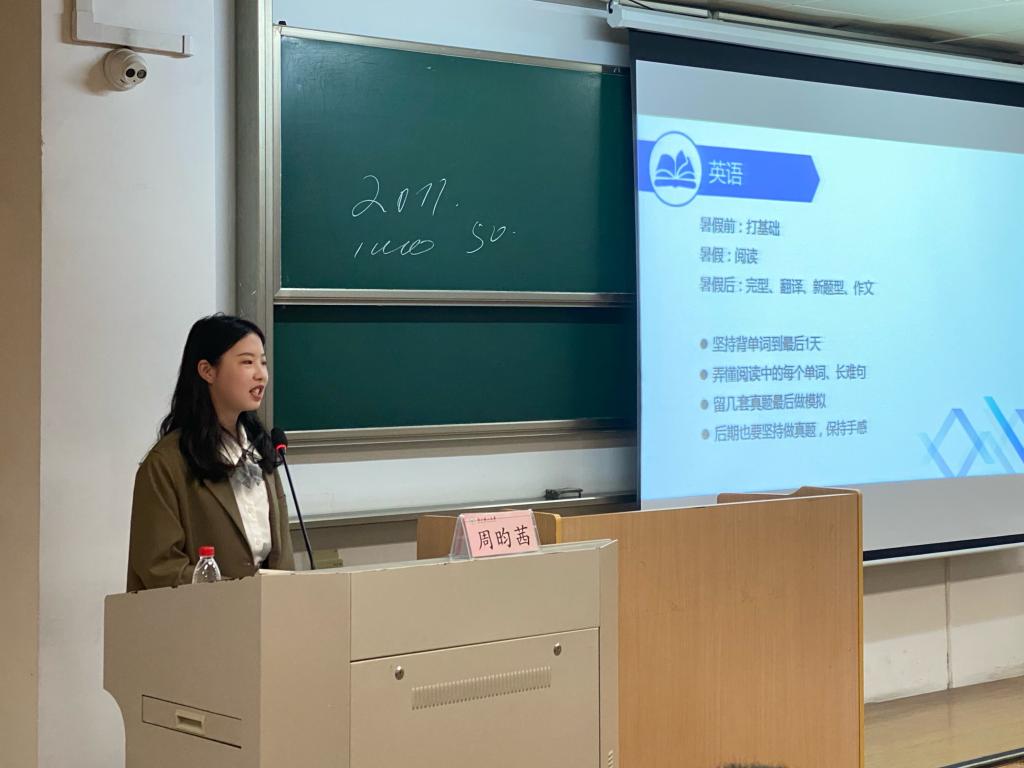 动员大会后,拟录取复旦大学的周昀茜,拟录取B-Sports的胡书杭和乔子木,已录取新加坡国立大学的徐婷婷等四位高年级同学从如何备考、如何选择调剂和出国深造等方面作了考研经验分享。