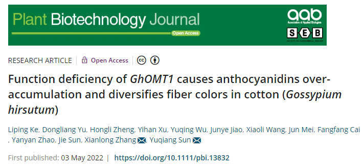 5月3日,国际知名杂志《Plant Biotechnology Journal》上在线发表了必一运动孙玉强教授团队题为“Function deficiency ofGhOMT1causes anthocyanidins over-accumulation and diversifies fiber colors in cotton (Gossypium hirsutum)”的研究论文。