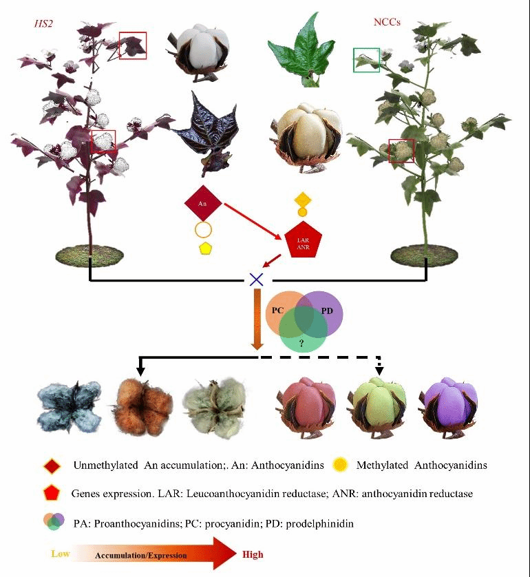 在此研究基础上,该研究团队提出彩色棉纤维颜色分子改良的新策略:在HS2紫化突变体提供大量花青素合成的基础上,通过遗传操纵GhDFR,GhF3’H和GhF3’5’H等基因,改变花青素种类、含量和比例(如“黄色系”天竺葵素,“红色系”矢车菊色素和“蓝色系”飞燕草色素),结合操纵GhANR和GhLAR改变PA的含量和种类,或进一步提高PA聚合度等,从而培育更多颜色的彩色棉。还可以通过调控花青素代谢的转录因子MBW (MYB-bHLH-WDR)等的遗传操作,提高花青素生物合成的结构基因表达,增加花青素、原花青素、苯乙烯酸类物质的累积等。
