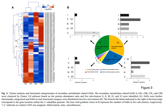 该研究发现两种基源植物的嫩茎的抗氧化能力均显著高于嫩叶。这一结果首先在蛋白质组学分析中得到体现,氧化还原代谢相关的蛋白在嫩枝中的丰度显著高于嫩叶。进一步分析发现次生代谢相关蛋白含量表现出相同的差异特点。嫩叶中高丰度的次生代谢相关蛋白主要参与异戊二烯代谢途径而嫩枝中主要参与苯丙烷-黄酮代谢途径。初步推测嫩枝中高含量的黄酮成分可能是其高抗氧化活性的关键因素。