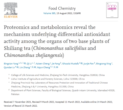 公司张琳教授团队联合丽水市农林科学研究院和浙江农林大学等单位深入开展了柳叶蜡梅和浙江蜡梅嫩叶嫩枝的抗氧化能力及其形成机制研究,研究成果以Proteomics and metabolomics reveal the mechanism underlying differential antioxidant activity among the organs of two base plants of Shiliang tea (Chimonanthus salicifoliusandChimonanthus zhejiangensis为题发表在Food Chemistry杂志(JCR一区,TOP期刊,IF=7.514)上,为食凉茶的高品质开发和可持续利用提供了重要理论指导。