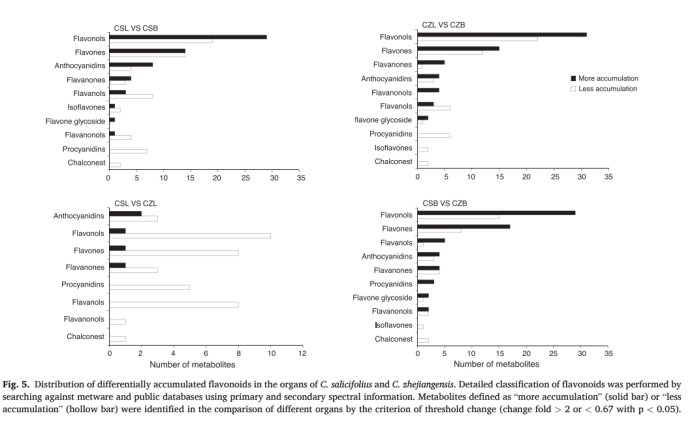 该团队利用代谢组学策略对以上结果进行了验证。结果发现四个组织中黄酮类成分的种类和数量相差不大,但其含量差别却十分显著。在两个物种中,嫩枝的原花青素含量均显著高于嫩叶。同时研究者还发现超氧化物歧化酶(SOD)和谷胱甘肽过氧化物酶(GSH-PX)在嫩枝中的活性比在嫩叶中更强。代谢组研究揭示了黄酮类化合物的组成,并证明原花青素在嫩枝中更丰富,以上结果证明两种植物的嫩枝可能由于SOD/GSH-PX活性和黄酮类化合物的含量优势使其处于较高水平的氧化还原稳态。嫩枝高水平的抗氧化活性可能在很大程度上是由于原花青素的高水平积累。