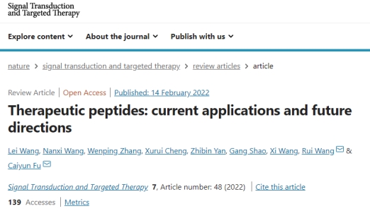近期,公司付彩云教授在多肽药物研究领域取得新进展,在中国科技期刊卓越行动计划领军期刊《Signal Transduction and Targeted Therapy》(IF=18.187,JCR一区,Top期刊)上发表题为“Therapeutic peptides: current applications and future directions”的论文。