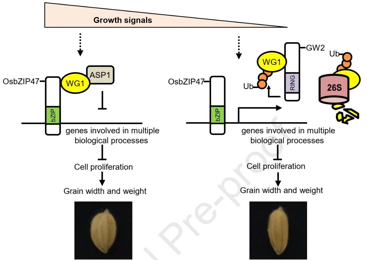 通过在发育的圆锥花序中过表达水稻基因以鉴定调控籽粒大小的因子,结果发现携带LOC_Os02g30850基因的株系显示出较宽、略短和加重的籽粒表型,并将该基因命名为WIDE GRAIN 1(WG1),其编码CC型谷氧还蛋白(OsGRX8)。利用CRISPR/Cas9技术获得WG1的功能缺失突变体,对其功能进一步鉴定发现,WG1正调控水稻粒宽和粒重以及器官的生长。结果表明WG1和转录因子OsbZIP47分别是粒宽和粒重的正/负调控因子。生长信号可以激活WG1以抑制OsbZIP47的转录激活活性,从而抑制下游基因的表达。WG1对OsbZIP47的抑制作用可能是通过招募转录共抑制因子ASP1来实现的(左图)。当生长信号减弱或消失时,编码E3泛素连接酶的GW2能够泛素化WG1并促进其降解,此时OsbZIP47的转录抑制被释放,从而促进下游基因的表达(右图)。