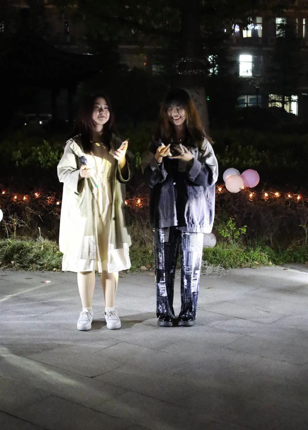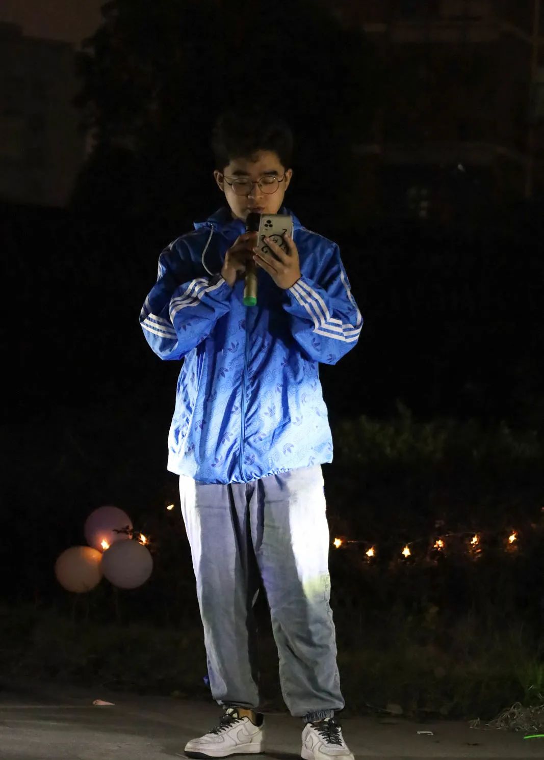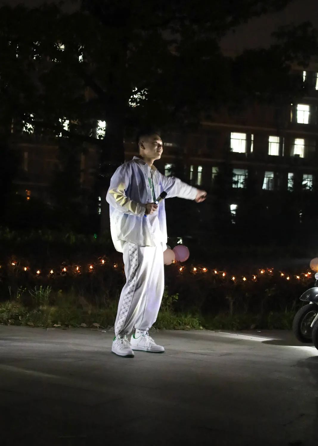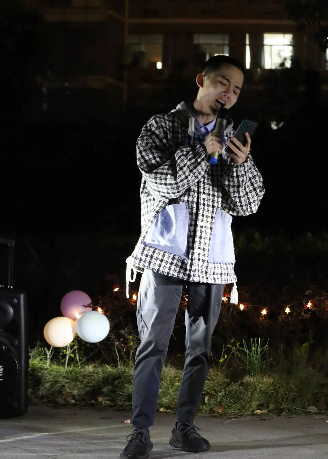 晚上的音乐会更是让人难忘。网上总是流传着一句话“青春才几年,疫情占三年”。在疫情的大背景下,我们的行动似乎十分受限。但是这场音乐会让我们感受到了什么叫青春。上前表演的同学们拿着话筒,热情地和同学们互动,下面的观众也打开手机闪光灯,随着音乐一起晃动。挂在树上的彩灯一闪一闪,风轻轻地掠过。如果要说此时此刻最好的形容词,大概就是青春。站在前面的他们闪耀着青春的光芒,在风中唱着属于青春的歌。
