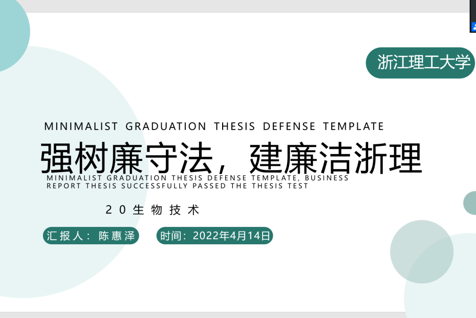 1月18日,习近平总书记在中国共产党第十九届中央纪律检查委员会第六次全体会议上发表重要讲话。总书记指出,年轻干部要坚定理想信念,牢记初心使命,扣好廉洁从政的“第一粒扣子”。“青少年阶段是人生的‘拔节孕穗期’,最需要精心引导和栽培”。4月以来,生医公司全体本科生班级在辅导员、班主任带领下积极谋划、精心组织,召开了“强树廉守法,建廉洁浙理”主题班会。通过形式多样、内容丰富、寓教于乐的主题班会,助力生医青年学子扣好人生第一粒扣子,擦亮青春清廉底色。