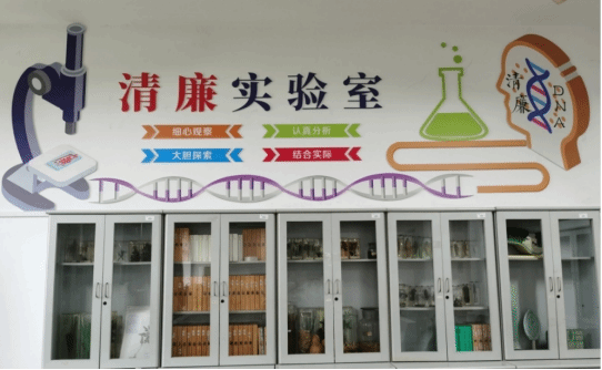 “清廉实验室”是公司另一廉洁文化建设项目。为进一步浓郁公司廉政文化教育氛围,公司提炼设计清廉元素,打造清廉文化上墙、清廉元素进所室,建有“廉政文化墙”和“清廉实验室”。廉政文化墙,凝练了公司“医”一身正气、两袖清风为特色的党风;以清廉干净、立德树人为特色的院风;以身正为范、处处楷模为要求的教风和以尊重规则、自律自强为特色的学风”。“清廉实验室”,用DNA线条将“廉”字引入显微镜下,寓意员工在科研过程中要遵循道德和学术诚信。