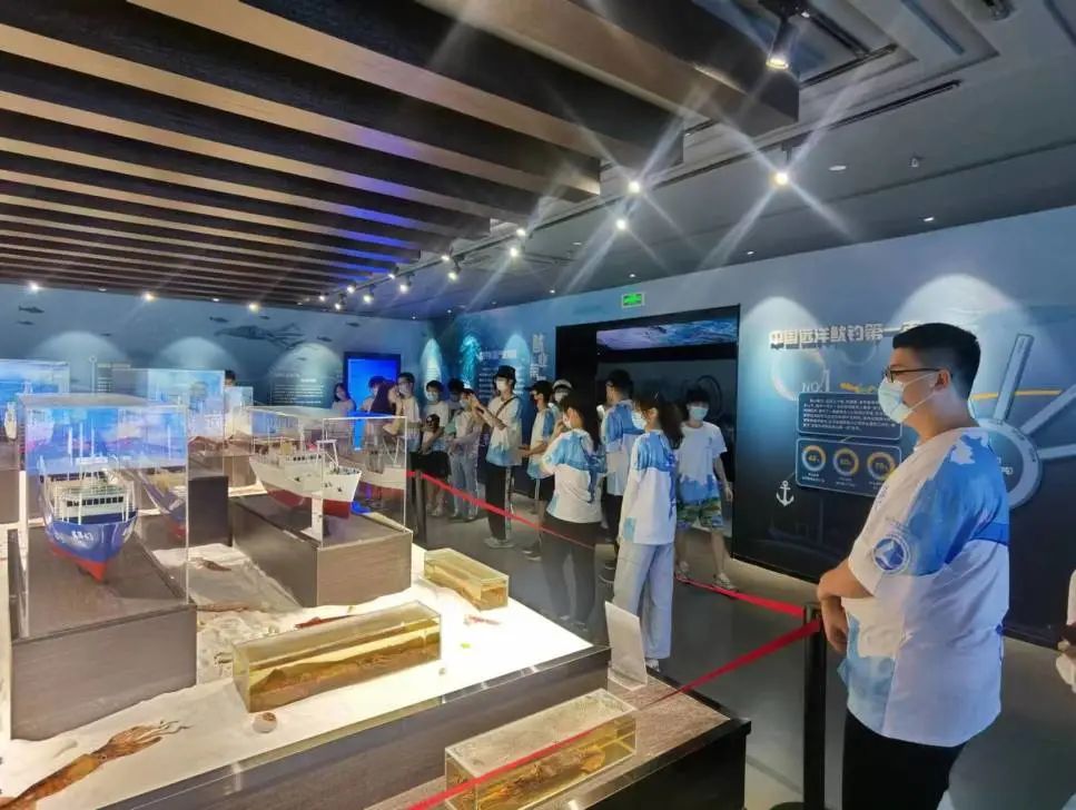 深邃浩瀚的海洋包罗万象,鱿鱼便是其中一羽。中国鱿鱼馆通过高技术动态图介绍不同类型的鱿鱼,其中三类墨鱼、鱿鱼和章鱼为标本展出,更为细致地展现了这些海洋动物的外观与结构特征。此外,同学们还观看了3D环绕式视频,通过立体的影像呈现出鱿鱼的进化史,同学们仿佛回到了远古的寒武纪,跟随着头足目从菊螺化石一步步走来,看这些海洋生物因环境的变化而逐渐分化、进化,并通过与投影设施互动,生动形象地学习到了海洋经济鱿鱼种类及主要分布地区。同学们沉浸在知识的海洋中,汲取着和鱿鱼有关的信息,不仅学习了鱿鱼的进化历程,还了解了远洋捕鱼的具体流程,熟悉了鱿鱼相关产业链的具体细节,对海洋生物资源开发利用有了更深的认识。