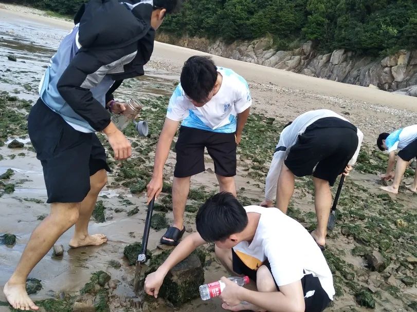 又回到了沙滩,同学们开始了新一轮的实践——沙滩海洋生物采样。伴随着桃花岛上悠闲的海风,同学们走到岩滩附近,去寻找这里的“原住民”。与泥滩采样的“步步维艰”不同,沙滩采样相对轻松,但也要付出不少汗水。不断掀开岩石,螃蟹、海蟑螂、寄居蟹等海洋生物四散逃开,同学们追赶围堵,将一个个生物放入样品瓶中。不只是岩滩边,岩壁上、石缝中、沙滩上……到处都有海洋生物的踪迹。在沙滩上,同学们寻找螃蟹挖掘的洞口,守住洞口、蓄势待发,当螃蟹出现的那一刻,便已经落入了手掌之中。再次收获满满,同学们心满意足地开始返航,满心期待第二天的鉴定中可以发现之前没有找到过的海洋生物。