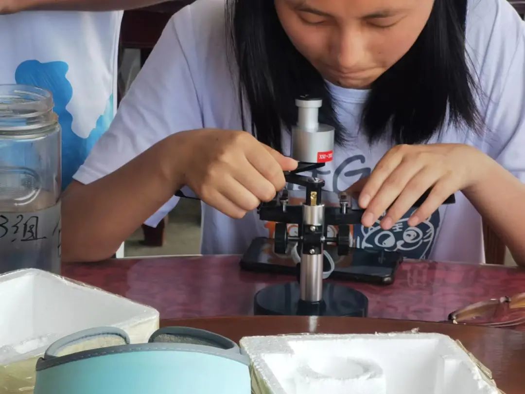 下午,同学们使用解剖镜将上午收集到的浮游动物进行观察,桡足类、糠虾等应有尽有。解剖镜没有固定光源,使用起来有一定的技巧,同学们在观察时,不断改变着物镜的位置,直到在一片白光中寻找到那个令人期待的生物。一遍遍寻找、一次次惊讶,一个个生物在同学们的不懈寻找中“露出真容”。在对每个浮游生物鉴定和拍照之后,同学们开始了下午的沙滩之旅。
