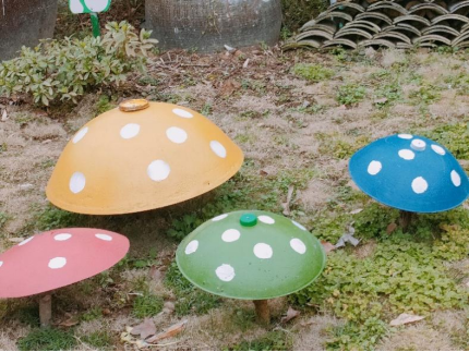 随着走访的深入,团队还注意到村里别出心裁的“装饰”。“这个蘑菇是用铁锅做的吗?真有意思”,一位队员说道。除了铁锅“绘”蘑菇,车轮栅栏、车轮垃圾桶等变废为宝的实例也随处可见。