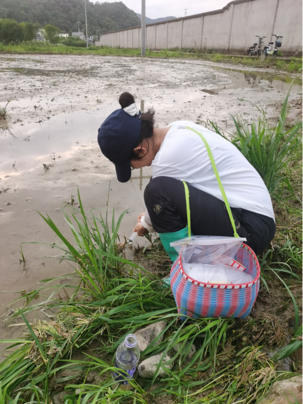 研究小组先对上梧溪流域内气象、水文和水质等农业生产面源污染背景数据进行收集和整理,在大家掌握相关信息之后,开始外出进行水质实地监测工作。监测首先在流域总出水口、重要支流汇入口和水源地采集地表水水样,进行总氮、总磷等水质监测。然后在流域范围内对9座水井进行地下水水质情况监测,用来估算地下水入湖水量及根据地下水污染浓度来估算地下水侧渗入湖污染负荷;最后根据上梧溪流域内农业种植现状,选择流域内有代表性的水稻田,利用土钻采集不同深度的土壤,获取不同深度剖面土壤含水率、有机磷等物理化学性质。同时采集水稻田上层覆水,用以分析土壤背景值和化肥施用等对氮磷流失的影响。