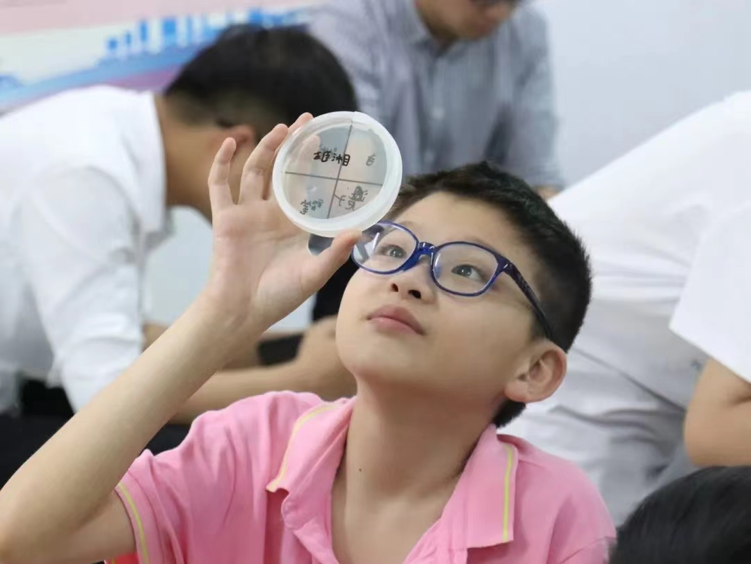 老区孩子在观察自己培养的微生物长势