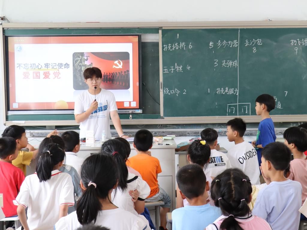 实践团成员在为老区留守儿童作“扣好人生第一粒扣子“爱党爱国教育报告