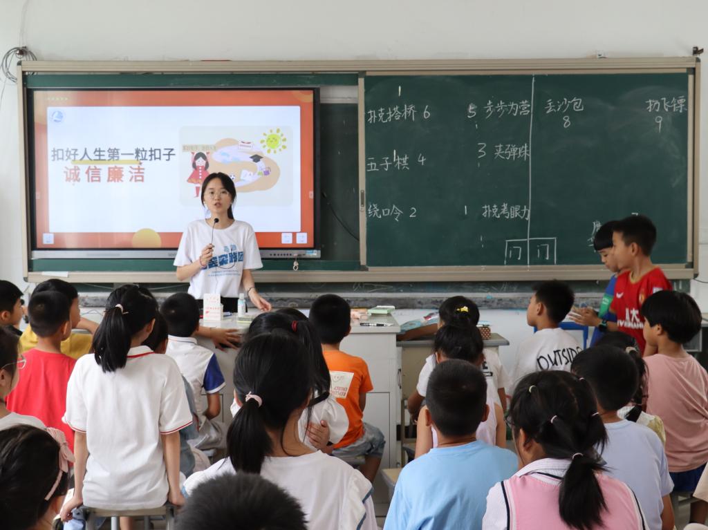 实践团成员在为老区留守儿童作“扣好人生第一粒扣子“廉洁诚信教育报告