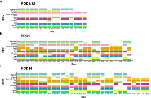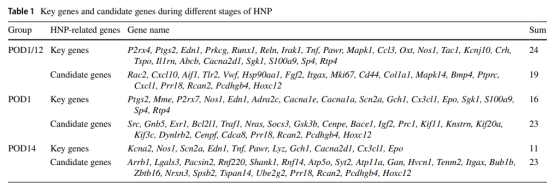 Fig.2 Hub genes at diferent stages of HNP. a, b, c The hub genes on POD1/12, POD1, and POD14 screened using Cytoscape's 12 centrality mathematical calculation method (CMCM)