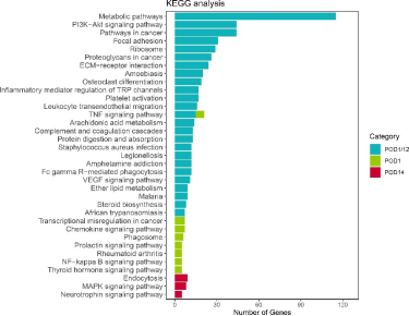 Fig.1 KEGG enrichment analysis of DEGs. The histogram shows that the KEGG pathway was significantly enriched by the DEGs on POD1/12, POD1, and POD14.