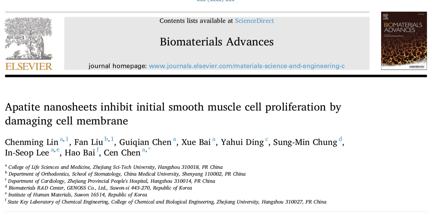 以通讯作者在中科院2区期刊“BiomaterialsAdvances”(IF=8.457)发表论文“Apatite nanosheets inhibit initial smooth muscle cell proliferation by damaging cell membrane”。金属血管支架在能够满足血管支架的力学要求,同时具有较高的生物耐受性和体内耐腐蚀性,但术后再狭窄问题严重限制了血管支架的长效安全性。目前的研究表明,赋予血管支架表面促内皮、抗增生的多重功能是解决当前面临问题的关键。因此课题组采用酸碱两步法处+仿生矿化法在钴铬表面制备片状磷灰石涂层,并在体外可持续释放钙离子。该磷灰石涂层有利于平滑肌细胞(SMCs)和内皮细胞(ECs)的粘附,同时可显著促进ECs的增殖,并且抑制SMCs增殖。进一步分析该现象发现磷灰石涂层释放的钙离子通过钙离子通道参与SMC细胞增殖的调控作用,使得 SMCs在具有薄片状结构的磷灰石涂层表面更易被刺穿,抑制SMCs的增殖能力。上述研究成果为具有纳米结构的钙基涂层的在生物材料方面的应用提供了新的思路。