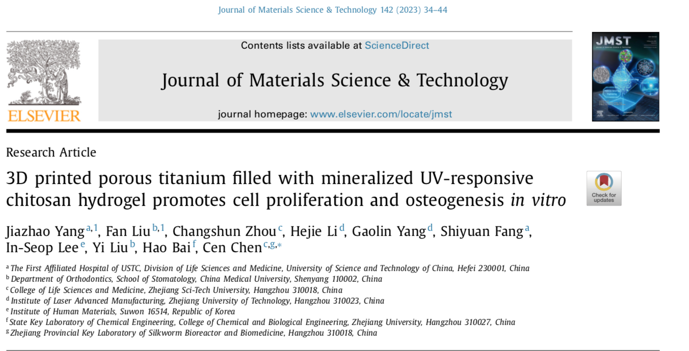 以通讯作者在中科院1区期刊“Journal of Materials Science and Technology”(IF=10.319)发表论文“3D printed porous titanium filled with mineralized UV-responsivechitosan hydrogel promotes cell proliferation and osteogenesis in vitro”。3D打印多孔钛因其优越的力学性能和生物相容性被广泛应于硬组织替换领域。然而,与实心植入体相比,具有多孔结构的钛植入体需要更高的骨植入效率和能力,从而满足修复骨缺损的临床需要。因此本利用光固化水凝胶的原位成胶性和钙基颗粒的仿生矿化能力,首次将矿化的光敏壳聚糖用于修饰3D打印多孔钛植入体的多孔结构。该矿化壳聚糖水凝胶可以原位填充至多孔结构的内表面,具有良好的生物相容性和成骨诱导活性。