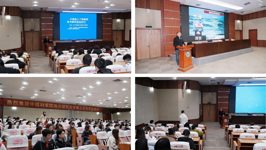 会上,梁宗锁对李新正的到来表示欢迎,并介绍了李新正的简历。随后,李新正分别从蛟龙号、发现号、深海勇士号三方面为切入点,按照时间顺序,过程穿插提问互动的方式,为大家详细阐述了其多次乘潜器下潜3500米深海进行生物考察与样品采集的经历,并生动幽默地讲述了发现海洋新生物时诸多趣事。李新正向参会师生科普了《国际海洋法公约》,并强调中国对海洋主权和领海完整的坚决捍卫。