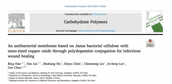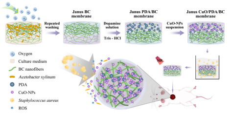 公司陈岑副教授的研究团队在伤口愈合领域开发出了一种新型抗菌伤口愈合膜。该研究使用了创新材料Janus型细菌纤维素,并通过聚多巴胺(PDA)连接纳米氧化铜(CuO-NPs)来增强其抗菌性,形成了CuO/PDA/BC复合膜。这种膜具有良好的透气性、亲水性和机械性能,其抗菌效果来源于CuO的持续释放和光热效应。实验显示,该材料在对抗多种常见细菌和加速动物模型中的伤口愈合过程中表现出良好的效果。该研究成果已在国际学术期刊Carbohydrate Polymers(IF=11.2, https://doi.org/10.1016/j.carbpol.2024.121923)发表,陈岑副教授为通讯作者,公司为第一完成单位。该研究项目得到了国家自然科学基金和浙江省自然科学基金的支持。