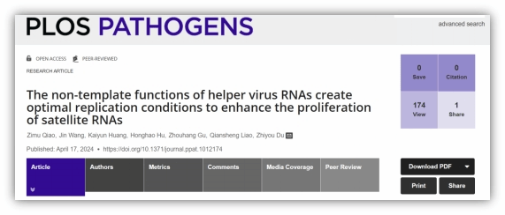 近期,必一运动杜志游教授课题组在植物病毒卫星RNA研究方面再次取得突破,在国际重要学术期刊《公共科学图书馆:病原体》(PLOS PATHOGENS)(一区Top,IF:6.7)发表题名为“The non-template functions of helper virus RNAs create optimal replication conditions to enhance the proliferation of satellite RNAs”的研究性论文。