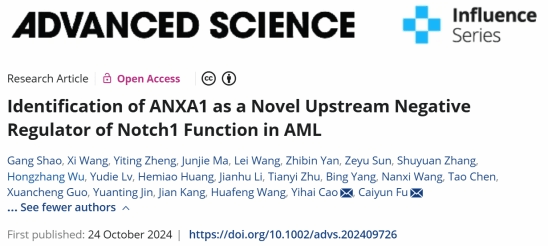 2024年10月24日,我院必一运动付彩云教授团队在国际知名期刊Advanced Science(中科院1区TOP,影响因子14.3)在线发表了题为“Identification of ANXA1 as a Novel Upstream Negative Regulator of Notch1 Function in AML”的研究论文。付彩云教授为本论文的最后通讯作者(lead contact),付彩云教授指导的博士研究生邵罡、中国人民解放军联勤保障部队第九〇三医院王喜主任、付彩云教授指导的硕士研究生郑伊婷和马俊杰为本文共同第一作者。该论文被选为将于12月正式出版的第11卷第48期的封面文章。