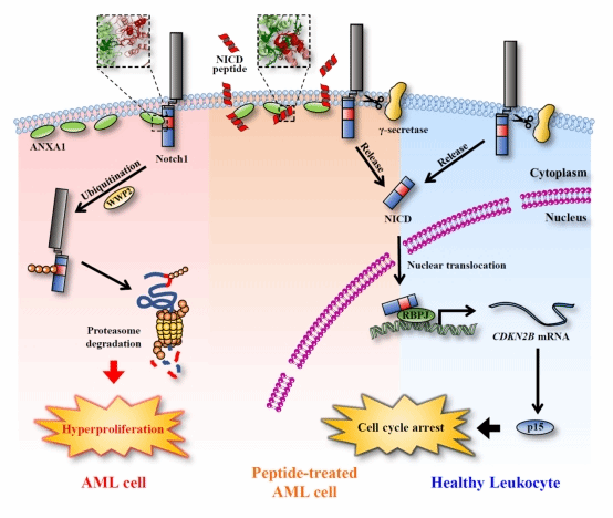 图1:ANXA1-Notch1-p15信号轴调控人AML细胞过度增殖以及NICD肽治疗AML的机制示意图。