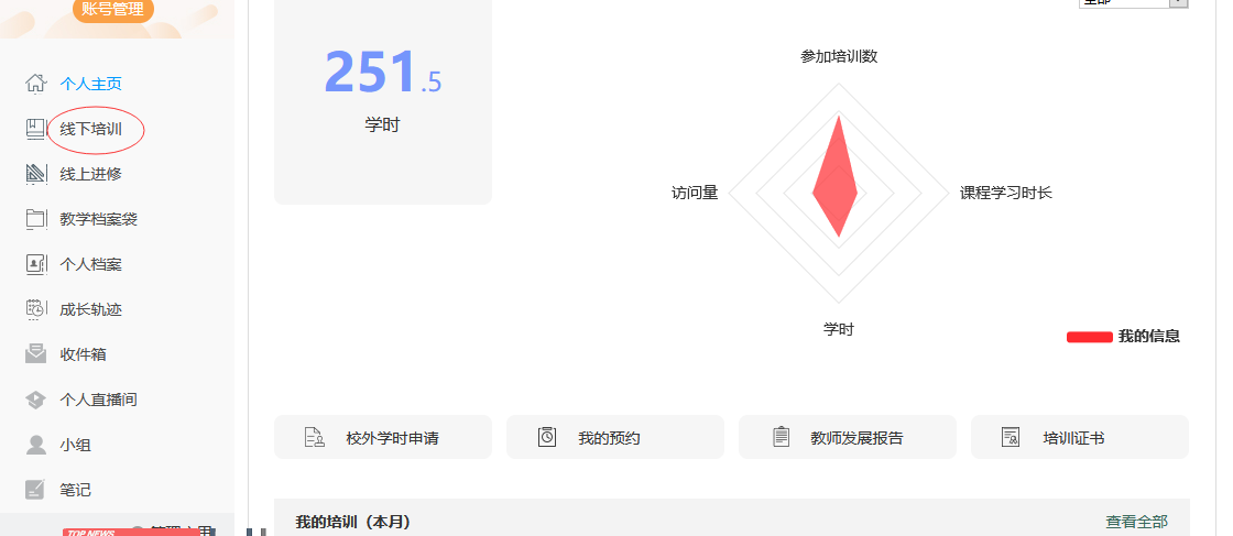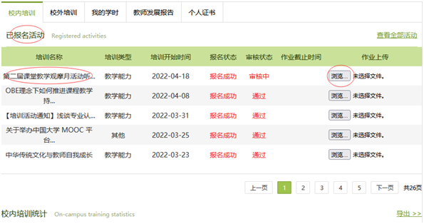 3.申请学分: 必须登录教发平台(电脑端)http://zstu.ctld.chaoxing.com/,进入个人“学习空间”,选择“线下培训”,在“培训名称”下找到“第二届课堂教学观摩月活动听课学时申请”,点击“浏览”,上传“B-Sports课堂教学质量评价表”。具体操作如下图: