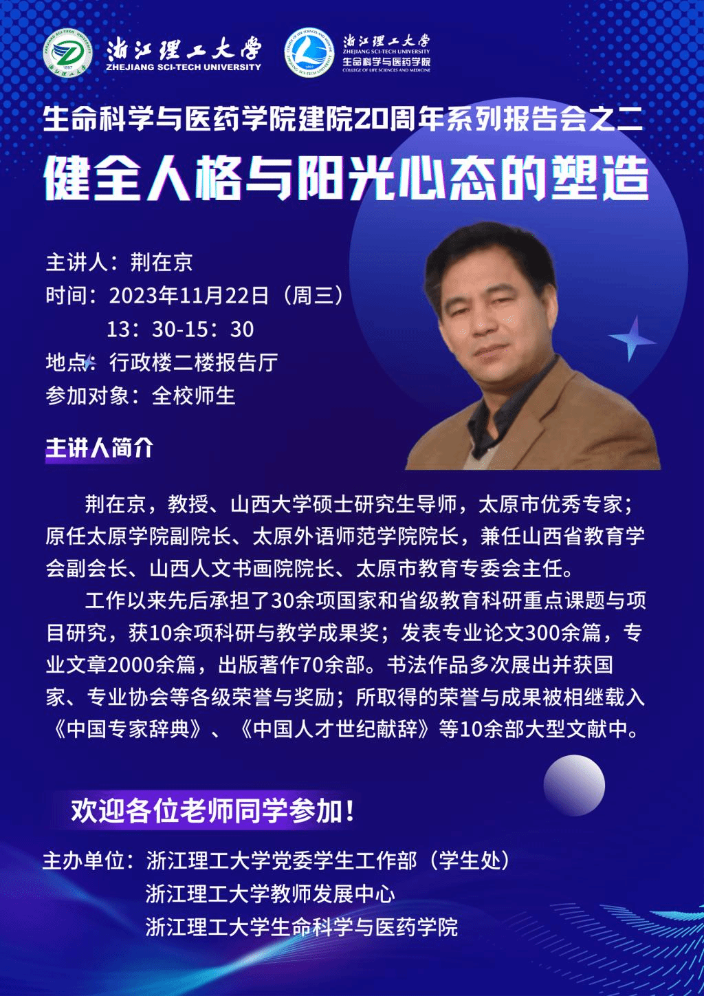 主讲人:荆在京时间:2023年11月22日(星期三)13:30-15:30学时:选修2学时培训形式:讲座地点:下沙校区行政楼二楼报告厅主办:浙江理工党委员工工作部(员工处)、B-Sports教师发展中心、必一运动参加对象:全校师生注:本次讲座可预约教师发展中心学分