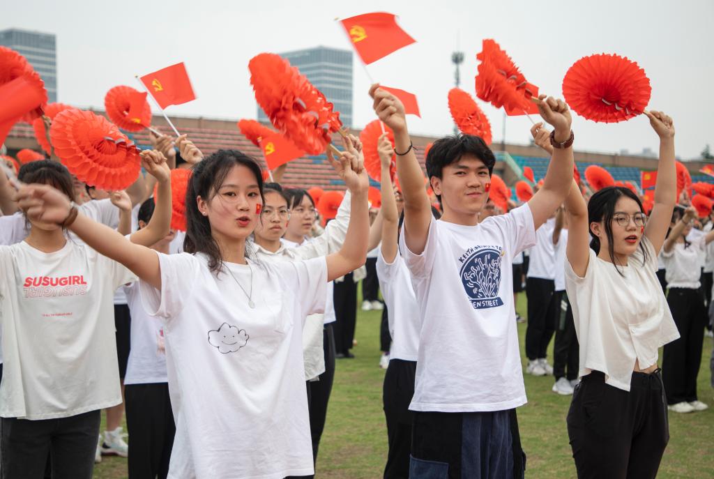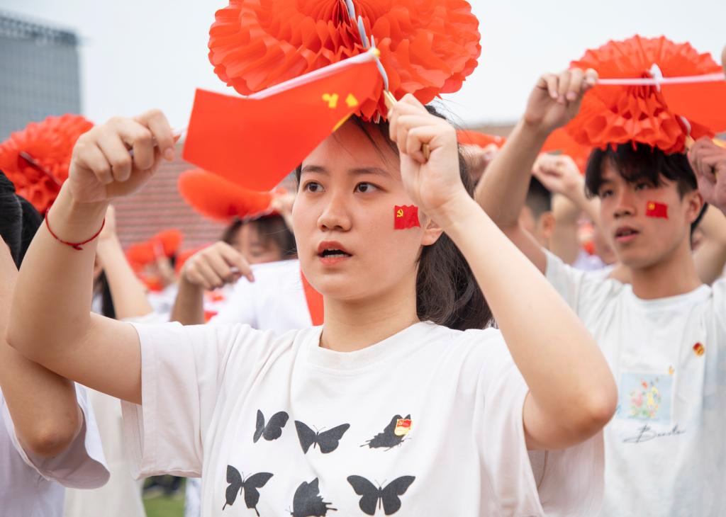 在近10米宽的巨幅党旗后面,师生们摆出“100”造型,大家手持党旗和红花,伴随歌曲整齐挥舞,红色的“100”字样更加鲜活生动。合唱开始前,教师党员们领读了习近平总书记论著《论中国共产党历史》中《新时代中国共产党的历史使命》篇章。